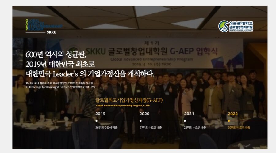 안녕하세요. 글로벌창업대학원 행정실입니다. 글로벌창업대학원에서 운영하는 공개과정’글로벌최고기업가정신과정’(Global Advanced Entrepreneurship Program) 4기 수료식이 11.9일(수) 수원 노보텔에서 진행되었습니다. 올해 5.18일(수) 개강하여 18주의 커리큘럼을 이수 하신 4기 원우님들께 다시 한번 수료를 축하드립니다. G-AEP는 본 대학원에서 2019년 국내 최초로 초기 창업기술기업, CEO와 임원들을 대상으로 한 Full Package Accelerating 프로그램을 개설해 창업 관련 핵심역량을 갖추고 글로벌 기업으로 성장할 수 있는 커리큘럼을 제공합니다. 교육을 통해 성공창업을 밀착 지원하고 ‘(주)킹고스프링’의 액셀러레이팅 프로그램에 의한 투자가 진행되며, 특히 올해는 G-AEP...Read More