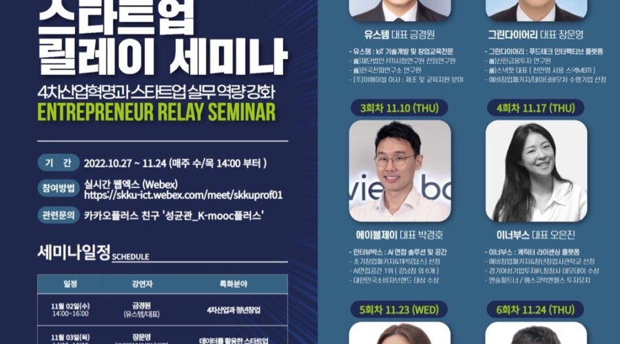 안녕하세요. 글로벌창업대학원입니다. 지난 11월 18일~19일에 글로벌창업대학원 2022학년도 2학기 기업가정신대회 및 학술대회가 개최되었습니다. 특히 이번 학술대회에서는 우리 대학원과 원우회, 그리고 성균관대학교 창업지원단과의 연합 행사로 진행되었으며, ‘세계 기업가정신 주간(GEW)’에 맞춰 다양한 프로그램 등을 통하여 대학원 내 기업가정신 확산에 마음을 같이 하였습니다. 이번 행사를 위하여 참여해주신 교수님, 원우님께 감사의 말씀 올려드립니다. Read More