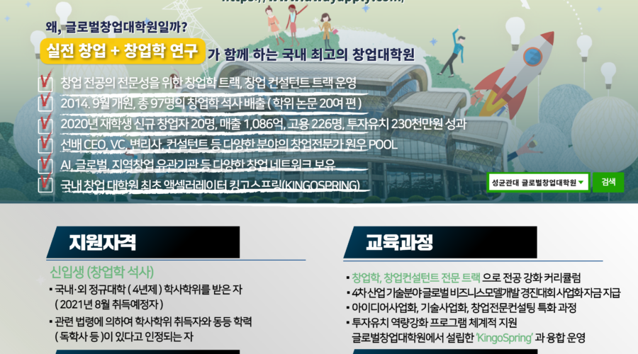 성균관대학교 글로벌창업대학원(원장 김경환)이 2021학년도 후기 신입생 모집을 위한 입학설명회를 4월 14일 개최한다. 성균관대학교 글로벌창업대학원은 2014년 개원이래 이론과 실무를 겸비한 실전형 창업교육을 통해 이미 36명의 창업가와 61명의 전문 컨설턴트를 배출한 명실상부 최고의 창업대학원이다. ‘창업학’ , ‘창업컨설턴트’ 전문트랙을 운영하여 차별화된 커리큘럼과 맞춤형 교과과정을 마련했으며 4차산업 기술분야에 특화된 융합형 창업인재 양성에 힘쓰고 있다. 출처 : 미래경제뉴스(http://www.mirae.news) http://www.mirae.news/news/articleView.html?idxno=3779Read More