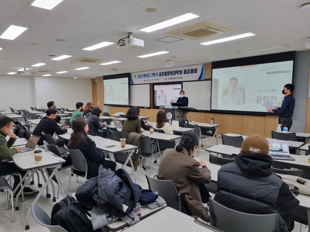 [2021년 2학기 종강총회 후기] 안녕하세요, 13대 원우회입니다. 12월 11일 토요일 2021학년도 2학기 종강총회(온라인 병행)를 마지막으로 이번 학기도 마무리가 되었습니다. 원우님들, 교수님들 모두 한 학기동안 고생 많으셨습니다.올 한해 잘 마무리하시고 내년 계획도 알차게 만들어 보시기 바랍니다.14대 임원으로 선출되신 원우님께 축하드리고 다음 학기도 멋지게 원우회 끌어주실 거라 믿고 응원 드립니다. 모두들 즐거운 방학 보내시고 종강총회 때 사진...