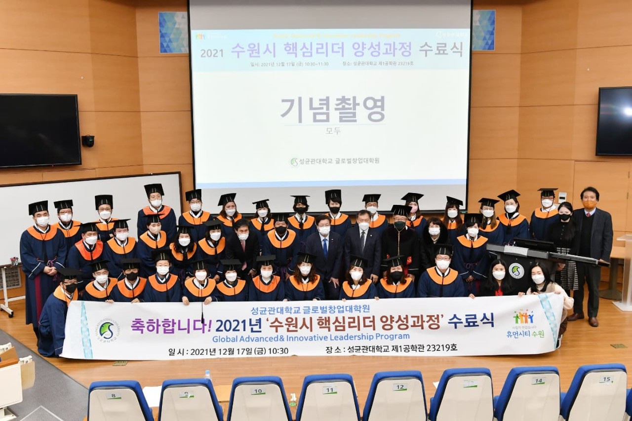 글로벌창업대학원에서 운영 하는 ‘2021년 수원시 핵심리더 양성과정’ 수료식이 12월 17일 개최 되었습니다. 이날 수료식에는 신동렬 총장과 염태영 수원시장이 참석한 가운데 33명의 수원시 팀장급(6급) 공무원이 총장 명의의 수료증을 수여받았습니다. 내년에 특례시로 승격하는 수원시는 지난 2015년부터 ‘핵심리더 양성과정’ 프로그램을 진행해 왔으며 우리 글로벌창업대학원이 올해에 이어 내년에도 계속 위탁 교육을 진행 예정입니다. 해당 과정은 우리 대학의 전문적인 혁신인재...