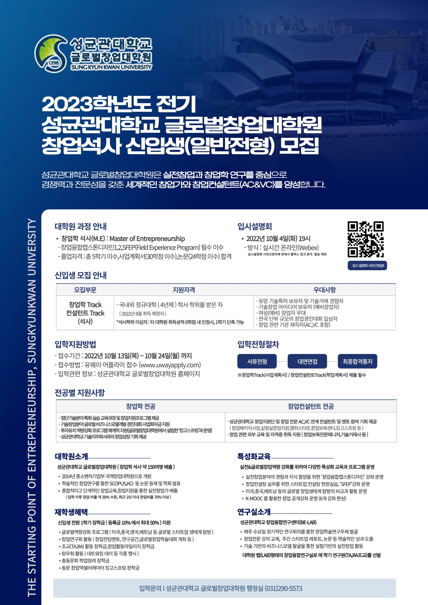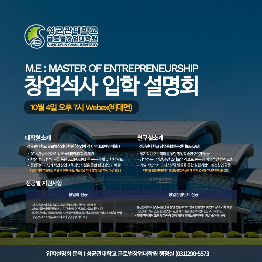 실전 창업과 창업학 연구가 함께하는 글로벌창업대학원에서 2023학년도 전기 신입학 온라인 입학설명회를 개최하오니 많은 참여 부탁드립니다!! 일시 : 2022.10.4 (화) 19:00 참여방법 : 아래 사전 신청하기 ** 사전 신청 후, 글로벌창업대학원에서 온라인 플랫폼과 세부 링크 추후 안내 ** 문의 : 성균관대학교 글로벌창업대학원 (031-290-5573) 많은 참여 바랍니다. 사전 신청하기 이 양식을 작성하려면 브라우저에서 JavaScript를 활성화하십시오.이름 *전화번호...Read More