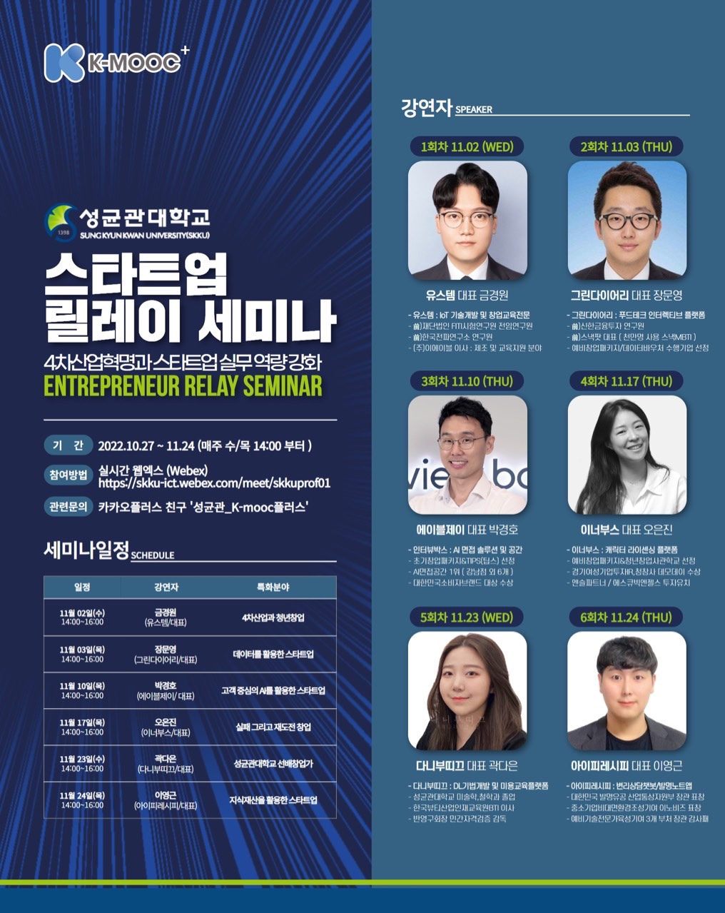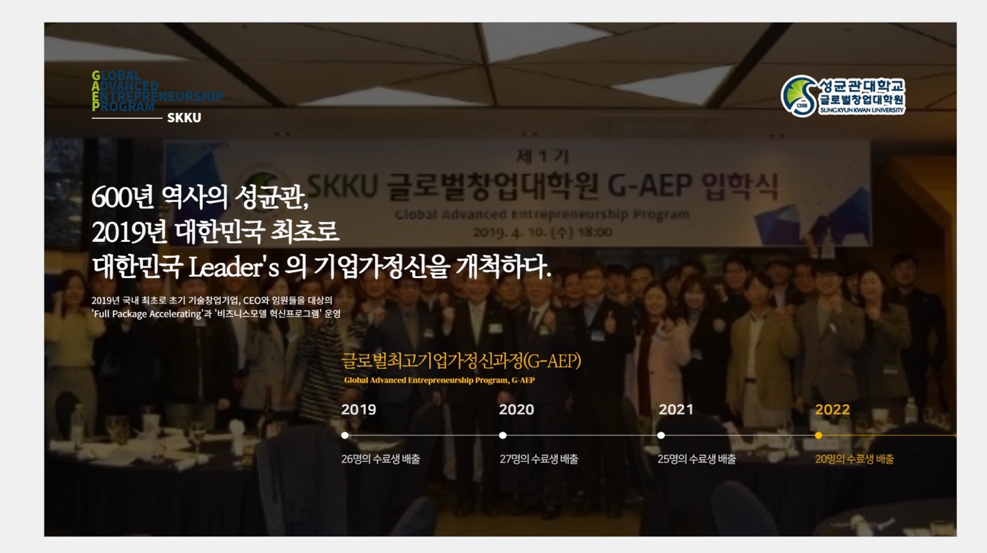 안녕하세요. 글로벌창업대학원 행정실입니다. 글로벌창업대학원에서 운영하는 공개과정’글로벌최고기업가정신과정’(Global Advanced Entrepreneurship Program) 4기 수료식이 11.9일(수) 수원 노보텔에서 진행되었습니다. 올해 5.18일(수) 개강하여 18주의 커리큘럼을 이수 하신 4기 원우님들께 다시 한번 수료를 축하드립니다. G-AEP는 본 대학원에서 2019년 국내 최초로 초기 창업기술기업, CEO와 임원들을 대상으로 한 Full Package Accelerating 프로그램을 개설해 창업 관련 핵심역량을 갖추고 글로벌 기업으로 성장할 수 있는 커리큘럼을...Read More