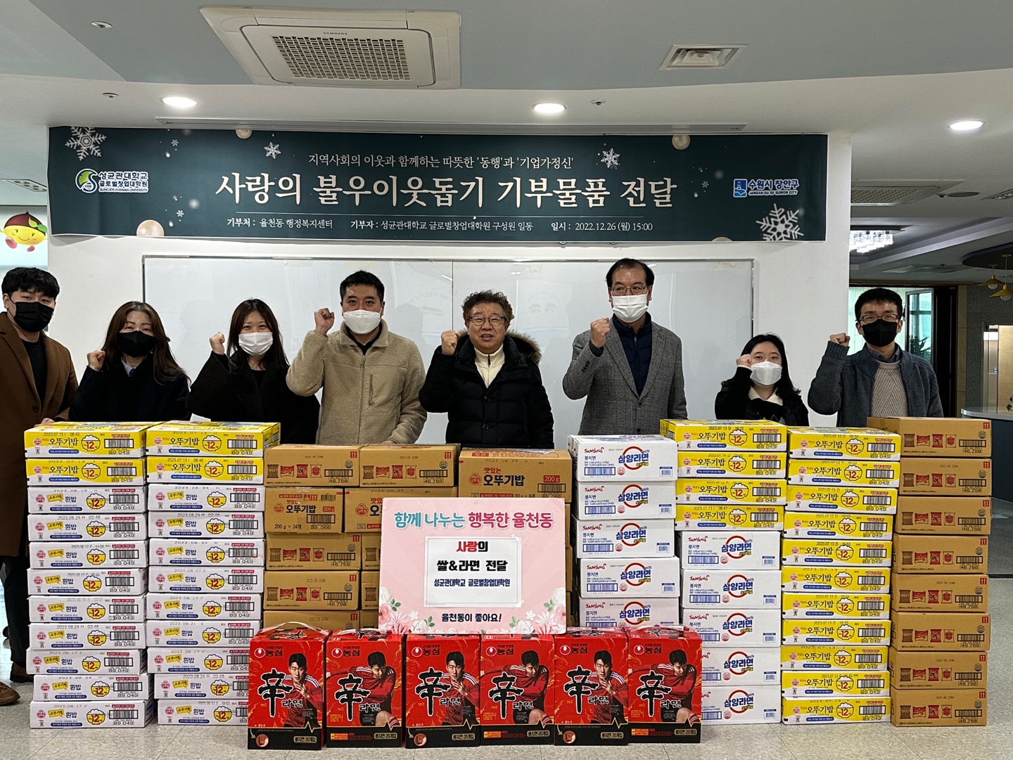 안녕하세요. 글로벌창업대학원 행정실입니다. 2019년 1월부터 글로벌창업대학원에서는 관내 율천동 행정복지센터를 통해 연말 기부행사를 진행하고 있습니다. 글로벌창업대학원 원우님들의 적극적인 동참이 매년 기부로 가능하였습니다. 올해에도 기부에 함께해주신 재학생 원우님들과 동문원우님께 감사드립니다. 12.26일 율천동 행정복지센터에 라면 및 즉석밥 85박스 전달하였으며, 율천동장님께서 진심어린 감사인사를 전하셨습니다. 글로벌창업대학원 홈페이지에 방문해 주신 모든 분들께 감사인사 드립니다. 다가오는 2023년 새해에는 더 좋은 일들과...Read More