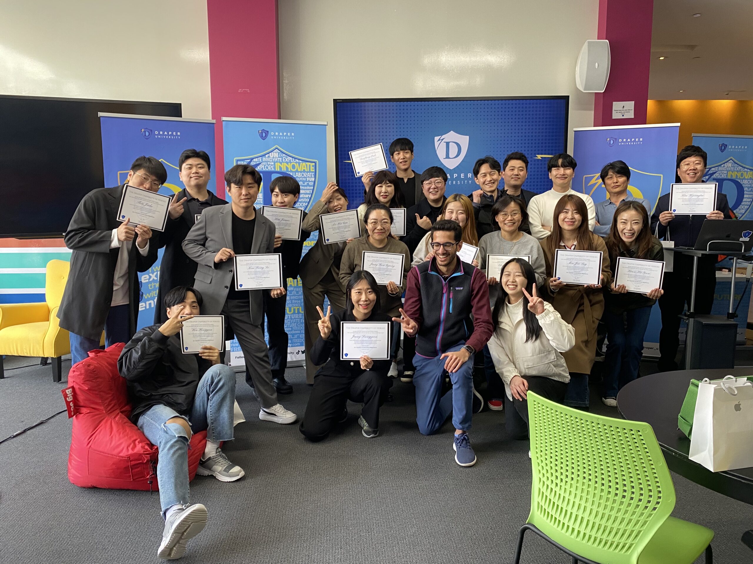 안녕하세요. 글로벌창업대학원 행정실입니다. 글로벌역량강화는 연합창업대학원과정의 커리큘럼으로, 연합과정 2기가 미국 실리콘밸리 Draper univ 에서 4주간 교육이 진행되었습니다.(2022.1.22.~2.19) 각자의 비즈니스 모델로 피칭 후, DU cetri.를 모두 받으면서 DU 실전교육이 마무리 되었습니다. 4주 과제, 토론, 발표, 인터뷰, 리더십캠프 등 준비와 참여에 모두 고생하셨습니다. 많은 것을 얻고 경험해서 각자의 비즈니스에 큰 도움이 되기를 바랍니다.