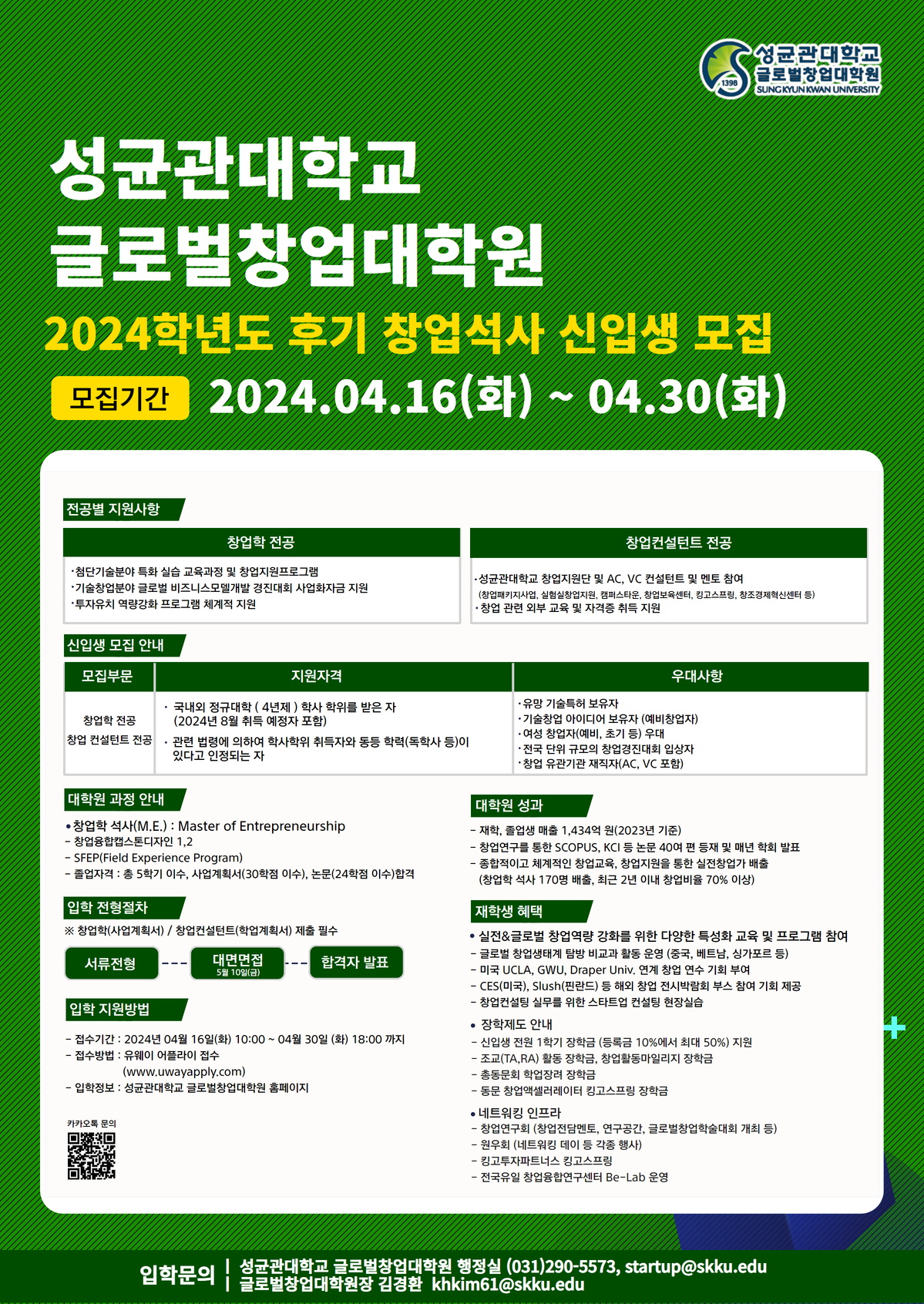 안녕하세요. 행정실입니다. 올해 개원 10주년을 맞이한 글로벌창업대학원에서 2024학년도 후기 신입생을 모집합니다. 자세한 일정과 성균관대학교 글로벌창업대학원만의 다양한 재학생 혜택, 장학제도, 네트워킹 인프라 등 포스터에서 확인 가능합니다. 궁금하시거나 문의사항은 글로벌창업학원 행정실로 문의 부탁드립니다. 031)290-5573 글로벌창업대학원을 찾아주신 분들께 감사드리며 화사하고 건강한 봄날 되시길 바랍니다. 감사합니다.
